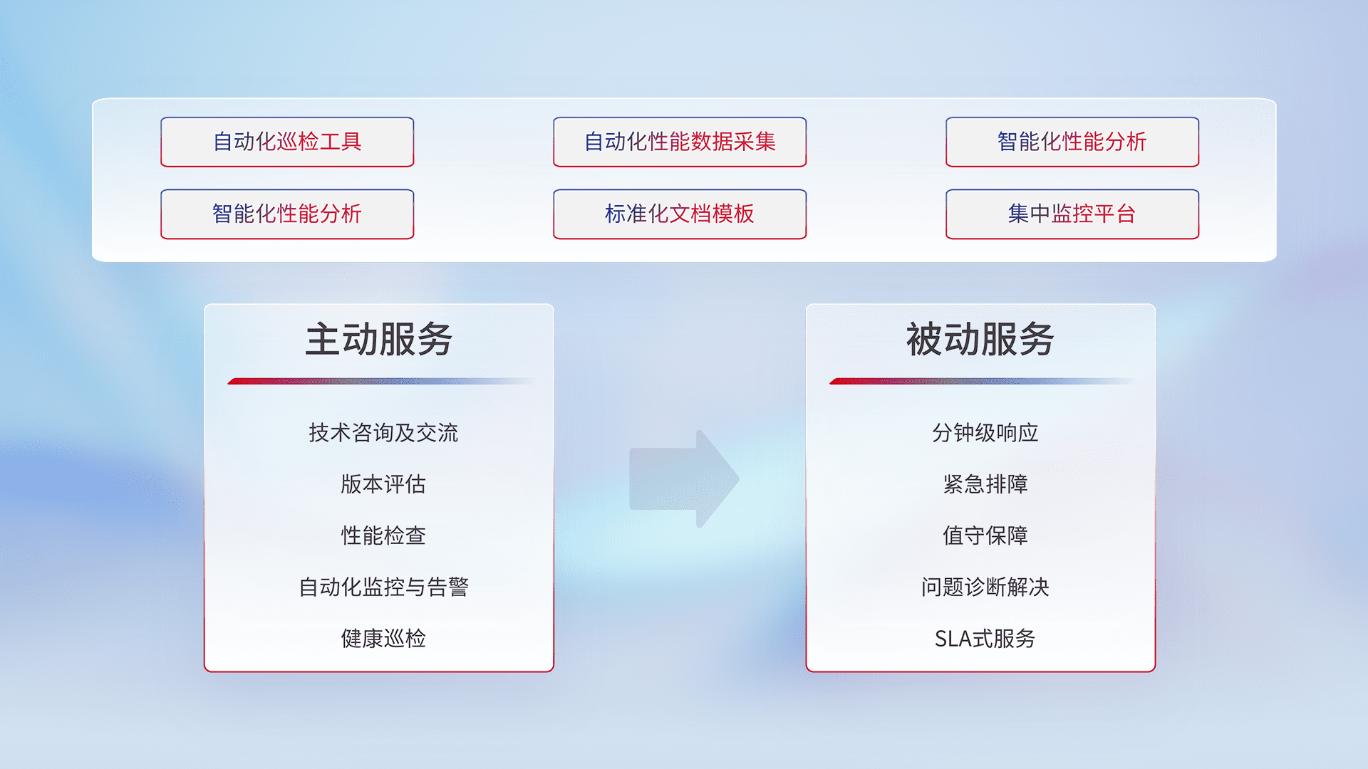 智能化工具和标准化文档,,,保障服务质量,,,,提供主动服务(包含技术咨询、、、、版本评估、、、性能检查、、、、自动化监控与告警、、健康巡检)和被动服务包含(分钟级响应、、紧急排障、、、、值守保障、、、、问题诊断解决、、SLA服务)。。。